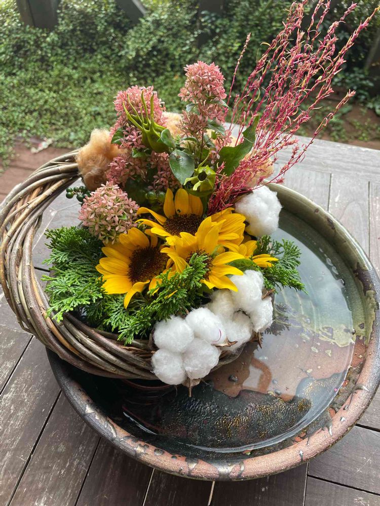 8月に種まきしたひまわり🌻の茎から小さな花💕コキアも赤く色付き綿の実も❣️久庭の花で遊びました😆🎶