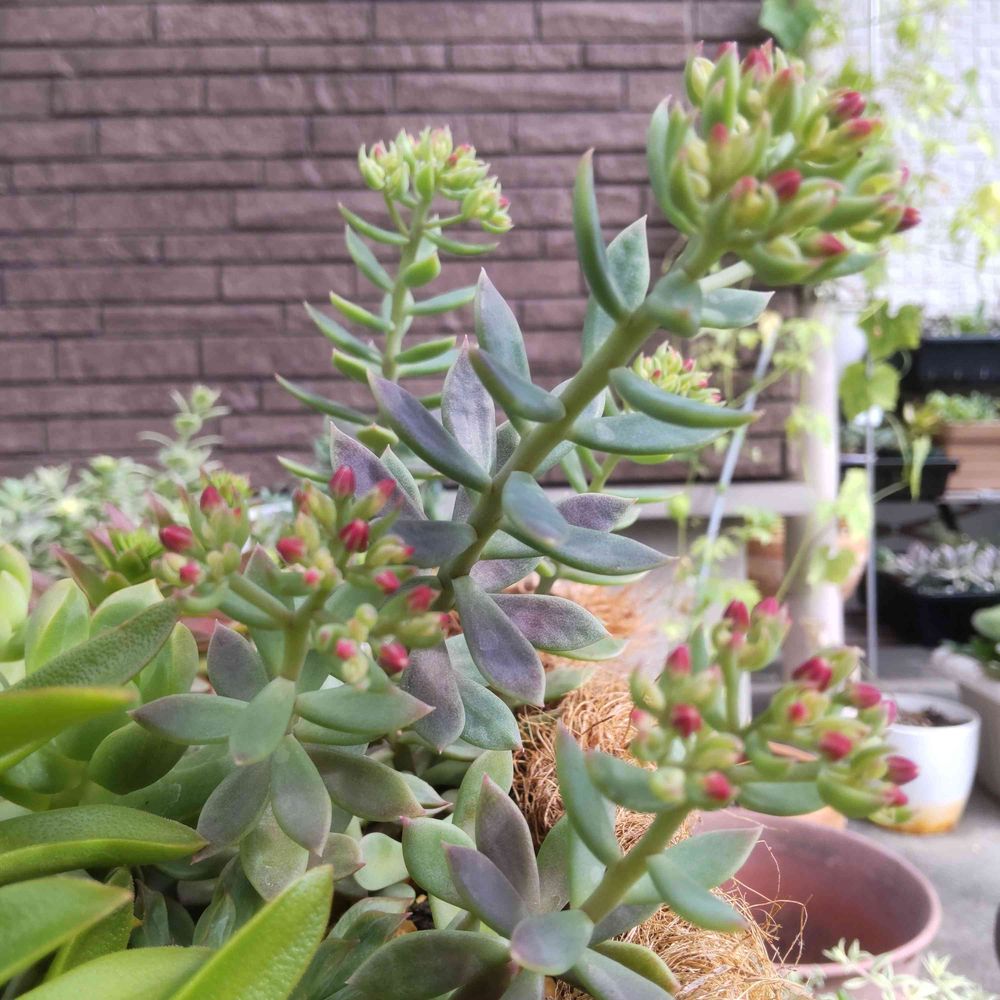 9月17日撮影🤳シノクラッスラのインディカさん。ダイソーとか100円ショップで購入したもの。高さがなくてペタンコで地味だけど、紅葉すると素敵なワイン色🍷になります💕変身✨春か夏に伸びてしまって😑高くおなりに。そして、蕾が沢山つきました。お花も綺麗な赤色になりそう😋