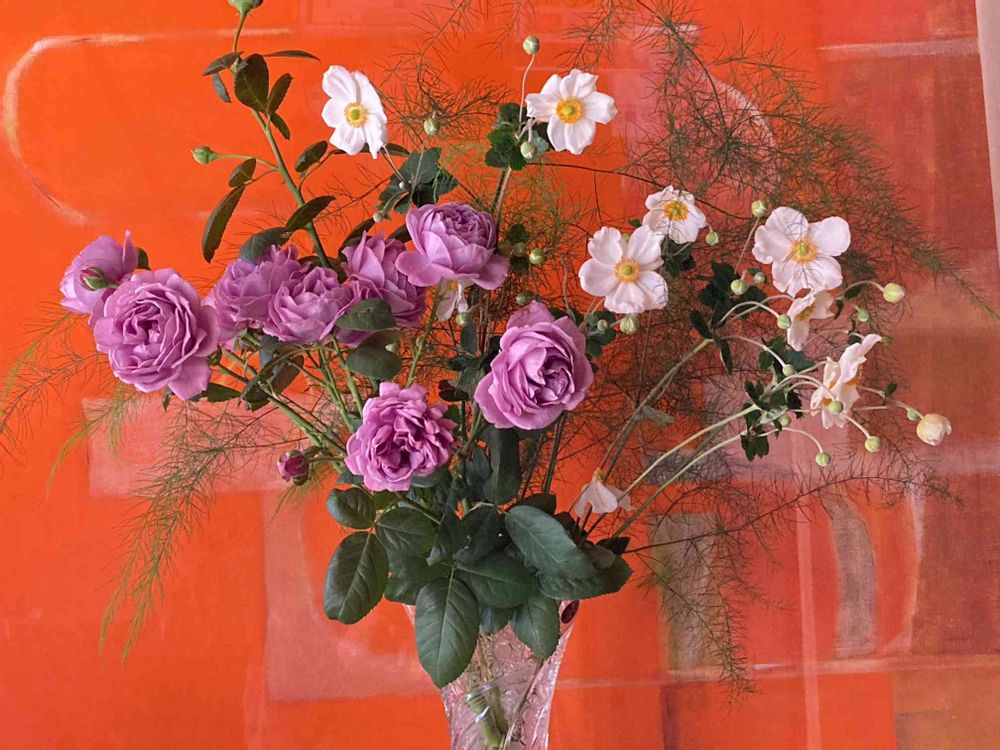 満開のシュウメイギクとアスパラを入れて撮りました💙