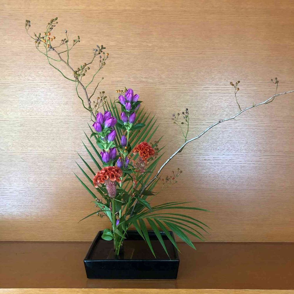 花材の組み合わせはとてもいいと思います。枝を短く使うとか、縦にではなく横のラインを強調するというような動きのあるものに挑戦してください。