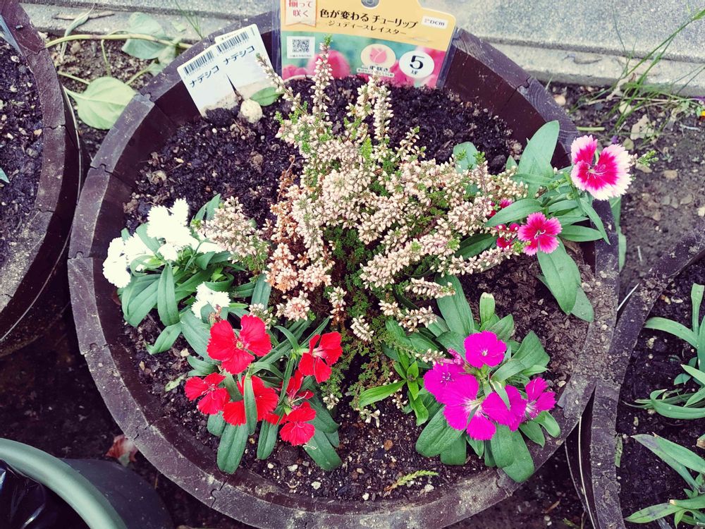 ナデシコはなるべく色味バラバラにしたくて。カルーナガーデンガールズは好きなので真ん中に背面にチューリップ球根仕込みました。ナデシコのちょこっとずつ違う表情を楽しむ寄植えです。よろしければご覧ください。
