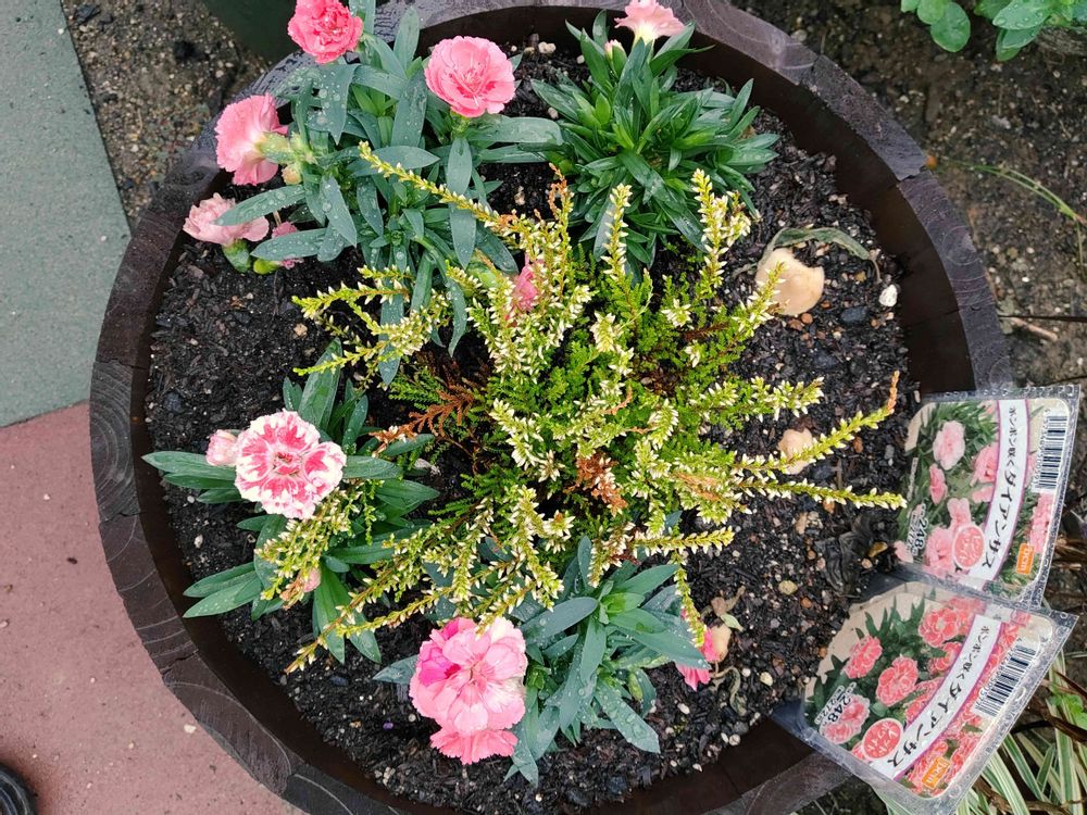 メインはポンポン咲くダイアンサス。ピンク系でお嬢様って感じに仕上がりました。ところでポンポン咲くとついてる以上君は花がら摘むと咲いてくるのかな?楽しみです。