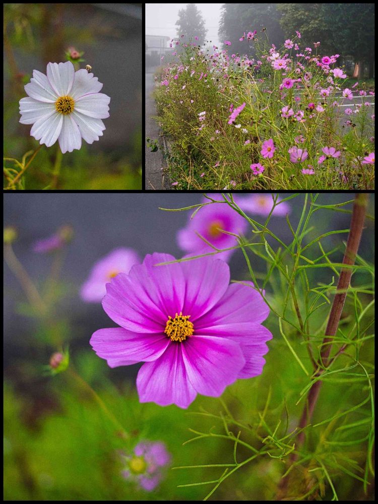 朝もやの中 ウォーキング中にであったコスモス