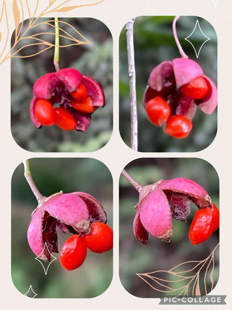 裂け赤朱色の種が顔を出し、開裂した果皮のせんたんに踏みとどまっている様子がいじらしく可愛い❣️