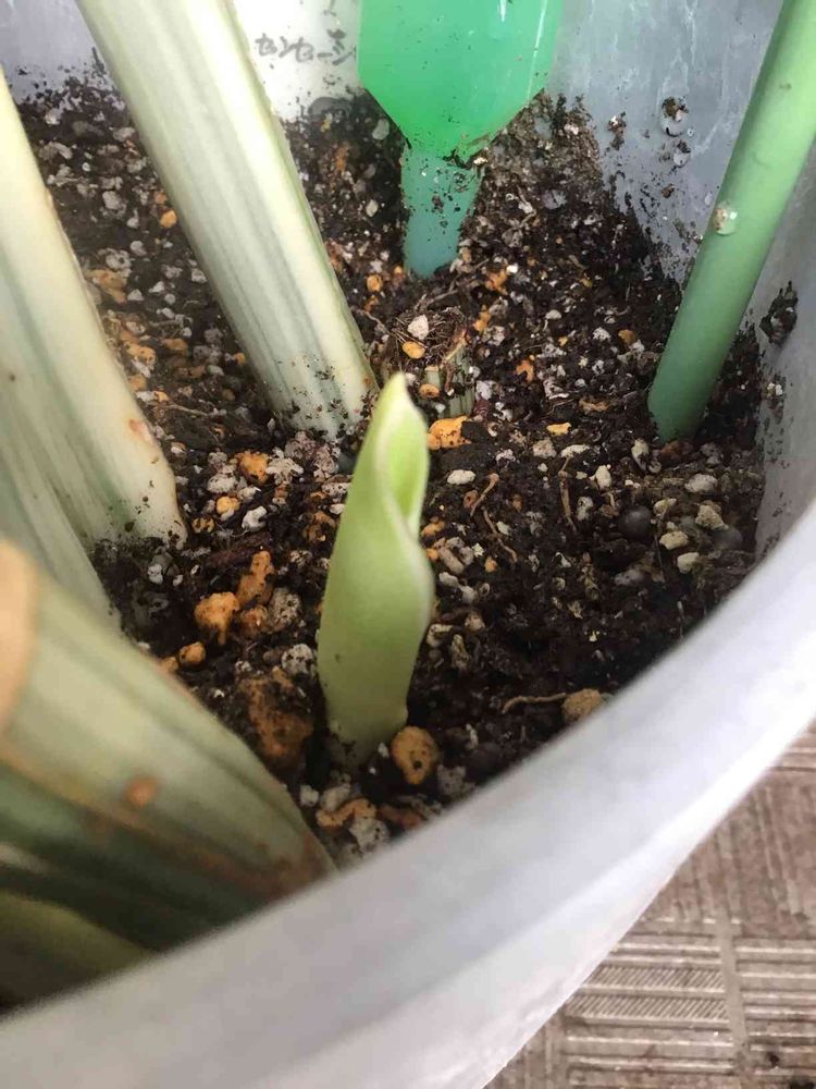 葉が倒れてきてしまい、いろんなアドバイスを聞いて植え替えやらお世話に翻弄された子でしたが、なんと新芽が出てきてくれてました!