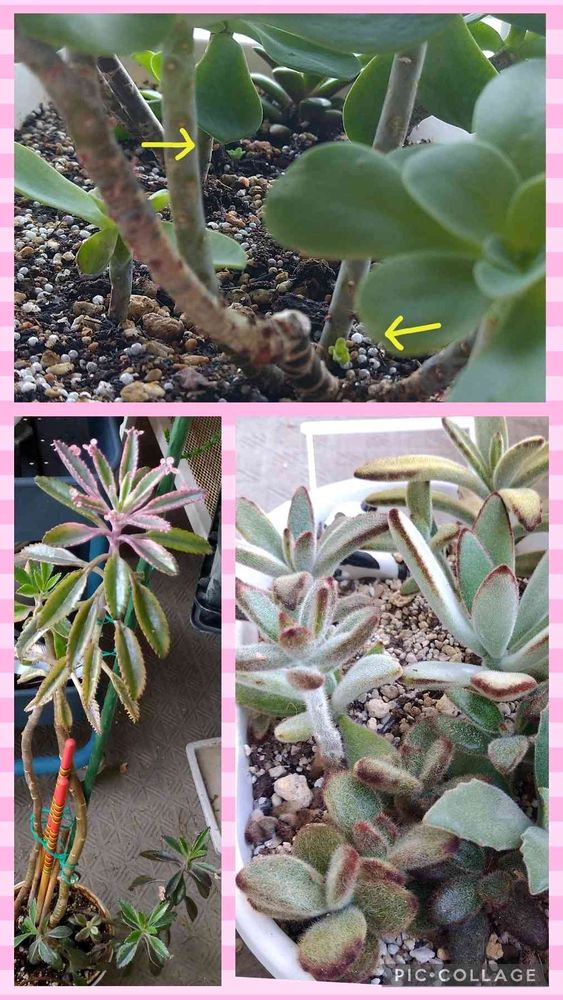 左下、不死鳥錦さん2株がどんどん成長して長い棒(茎)になってます☺根本にはベビー達も成長してます💓親株は測ったら58cmは有りましたよ😀