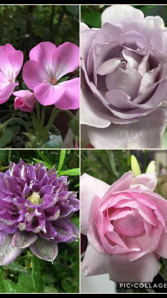 左上ゼラニウムリンゴラベンダー、その下は、やっと、やっと咲いてくれたクレマチスです🤣