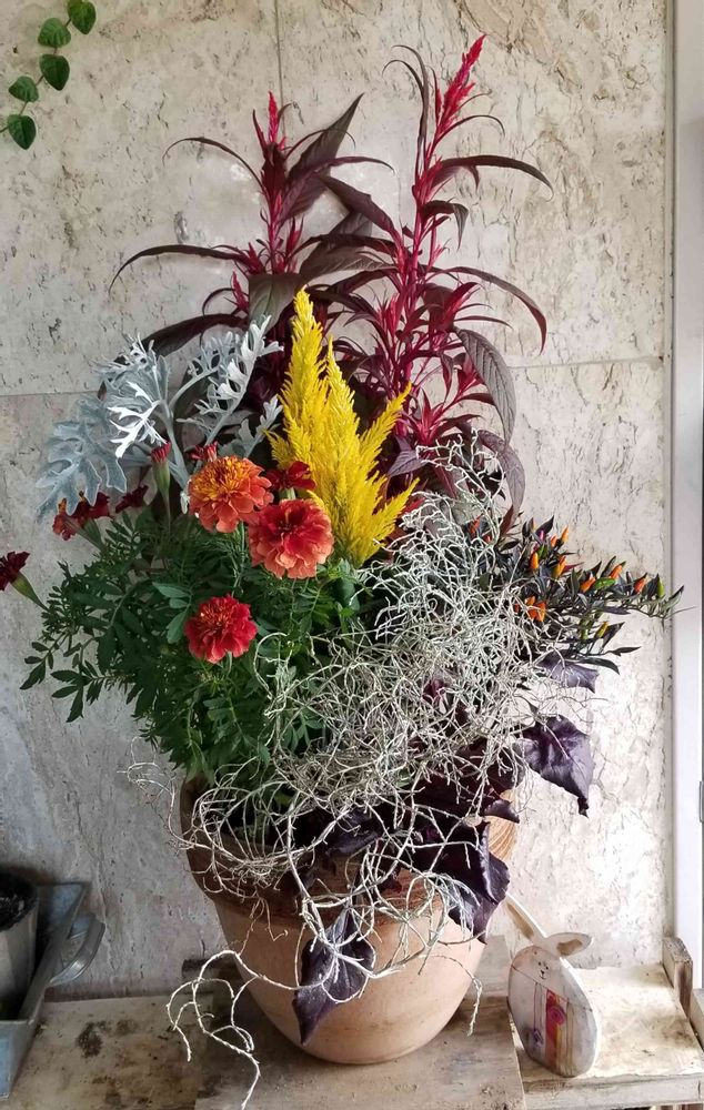 背いたかのっぽのケイトウを見つけたので、カレックスと寄せようとイメージしてたらハロウィンぽいマリーゴールドにであい、結局ハロウィン仕様になってしまった😄