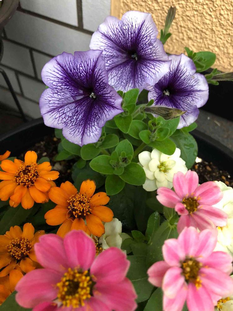 連休中にペチュニアとジニアの寄せ植えをしました。