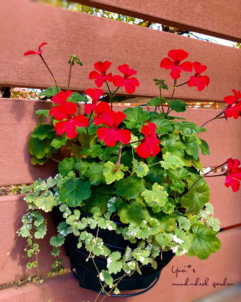 赤い花は遠目でも鮮やかでとても映えるので良くハンギングに植えてます♪