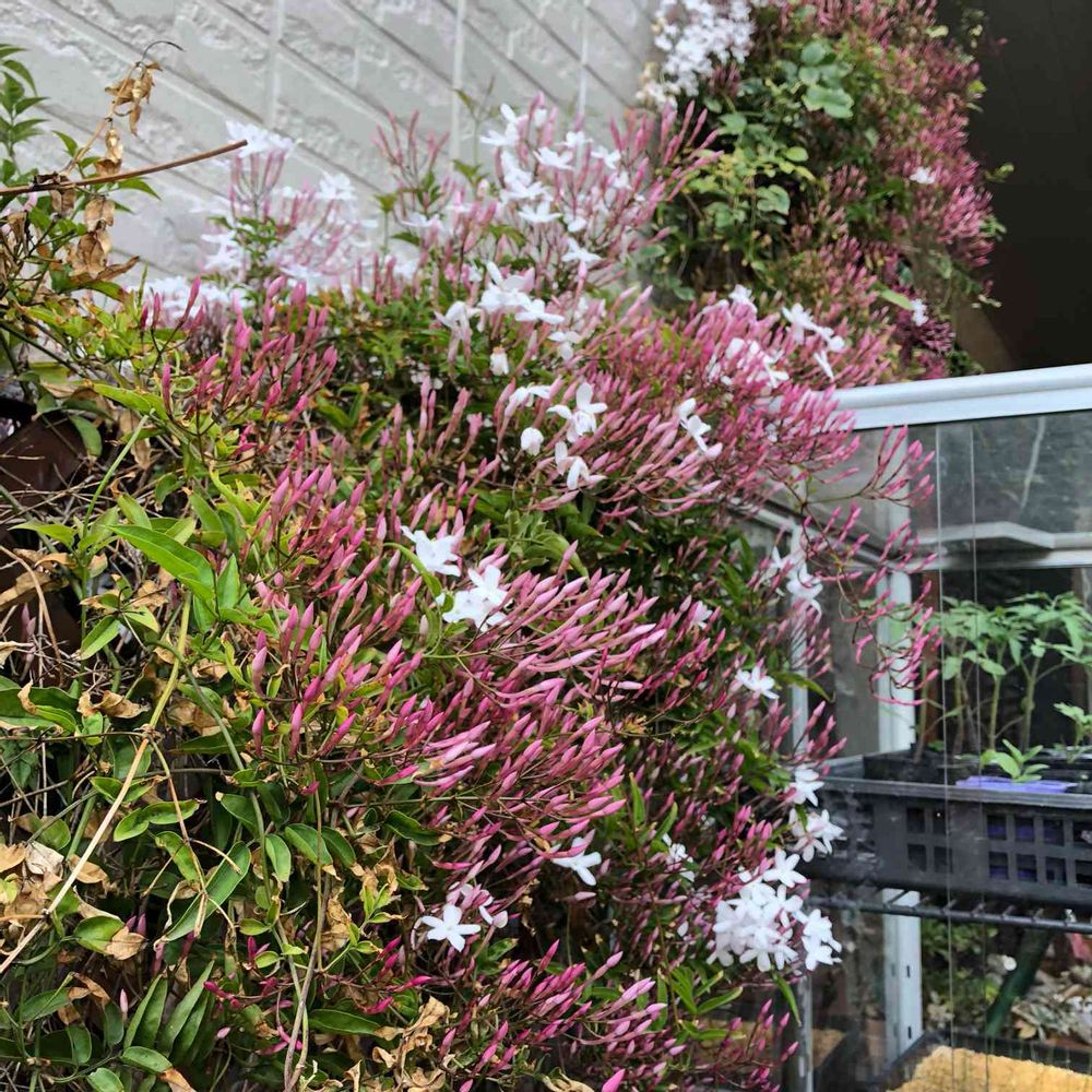 窓を開けてると毎朝ジャスミンの香りがお部屋に入ってきて•*¨*•.¸¸♬な朝💕雨樋つたって、二階のベランダへ行こうとしてます😅