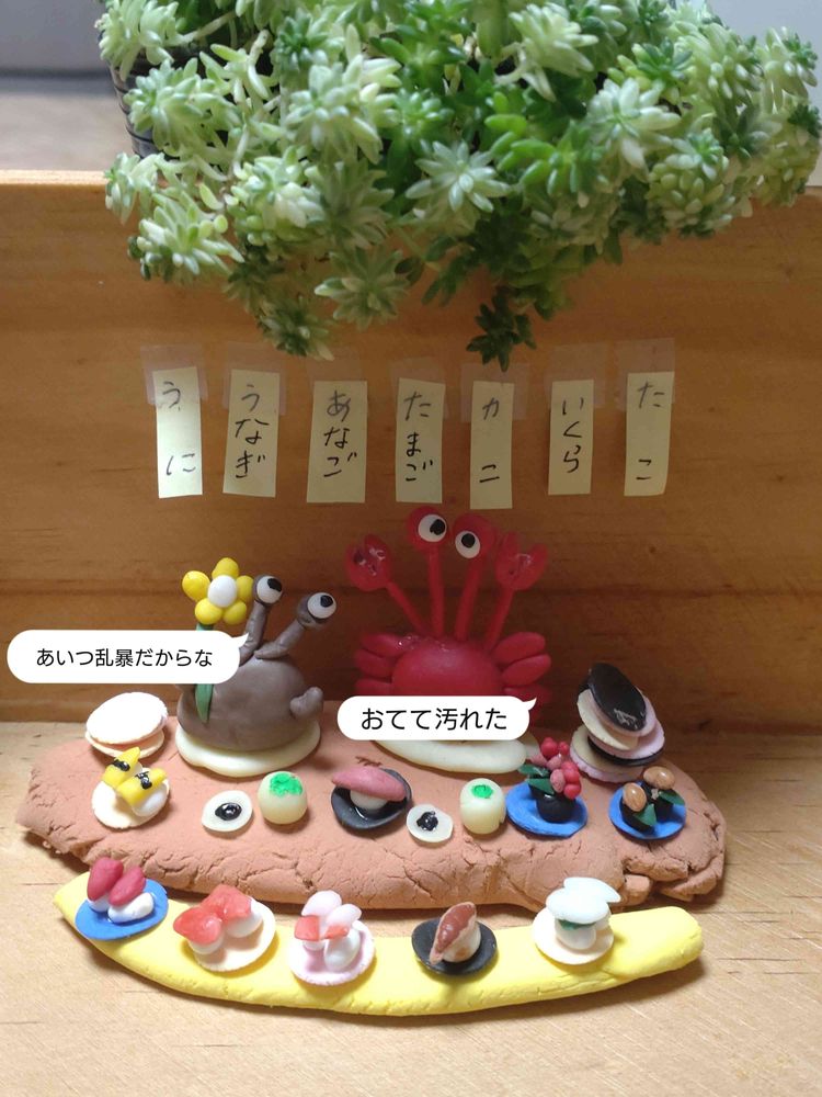 お寿司は案外簡単なんですよ〜。ネタの大きさも不揃いでガタガタなんです。シャリなんて白粘土を適当に丸めただけ🤭