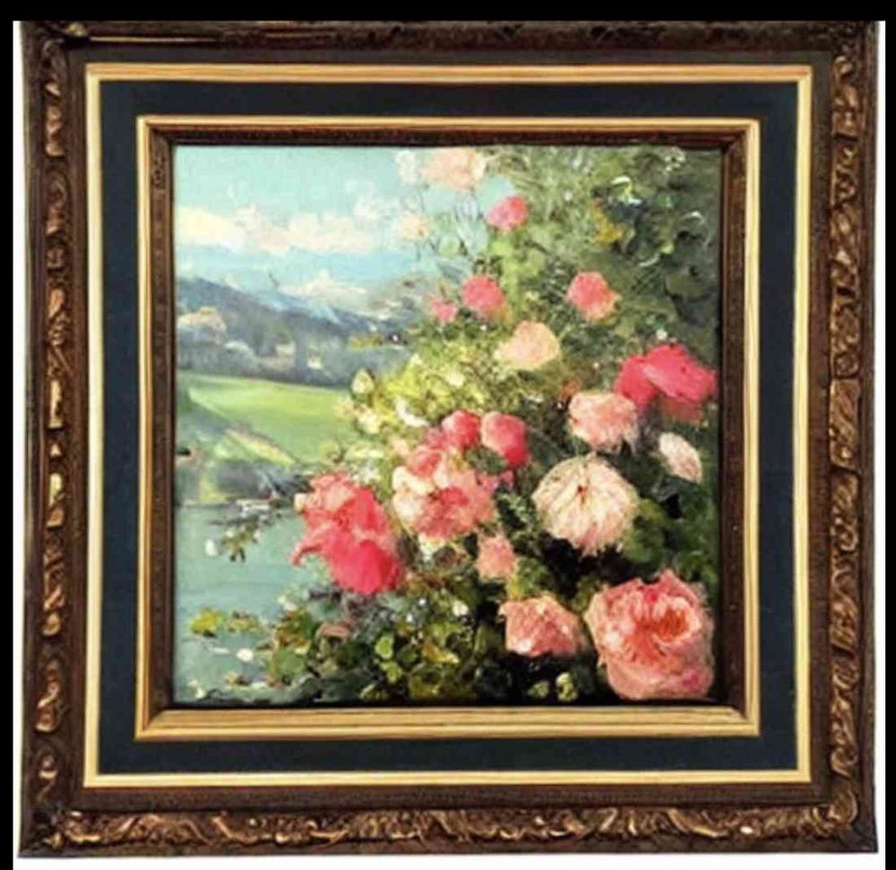 8K,高品質,写実的,油絵, Olga Wisinger-Florian,花の風景画,木製額付きで絵の全体を描く