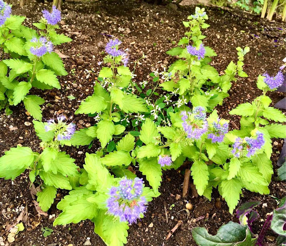 我が家の花壇のお花さんと似ていますが、カリオプテリスはダンギクの近縁種で、夏からあきにかけて小さな集合花を節ごとに段状につけます。