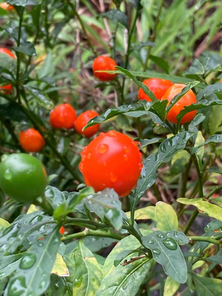 南米原産の常緑低木。花期は5-9月頃であるが、花よりも果実を鑑賞するために栽培される。結実は8-12月頃で、球形の果実が赤く熟していくところを鑑賞する😊🌸