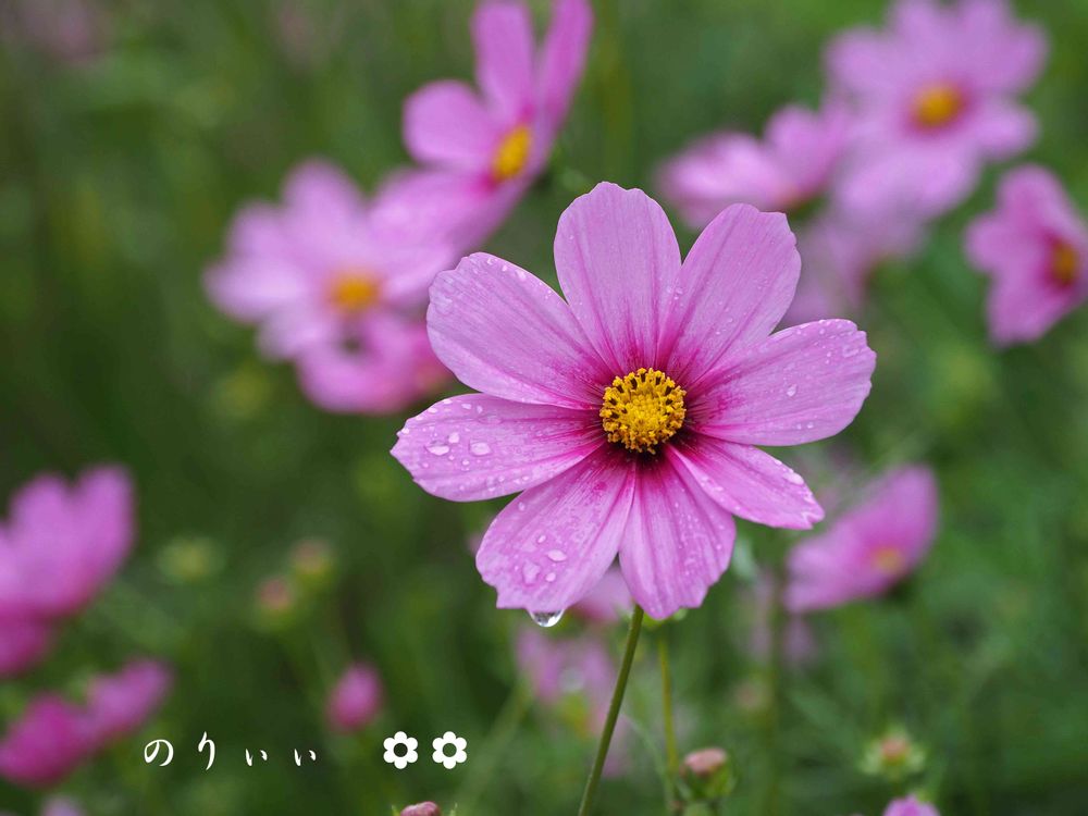 ピンクのコスモスの花弁に雨粒が光っていてきれいですね
