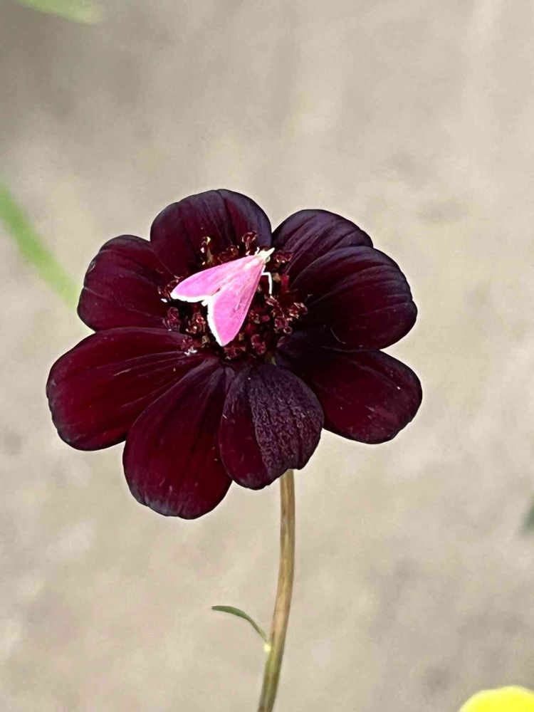 チョコレートコスモスにピンクの蝶が止まってる🦋と母が呼ぶので見に庭へ出ると