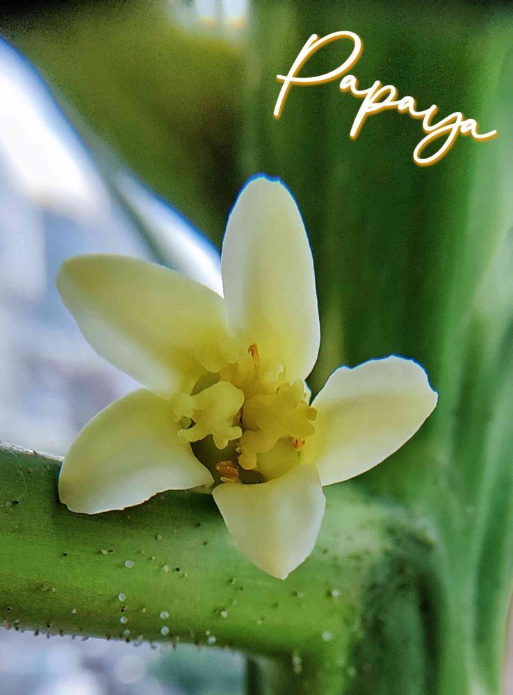 日本には家庭栽培用の矮性のパパイヤも売っているようだけど、多分これは中国の南方でスクスク育ったパパイヤだろうから、日照不足気味な上海の小さな鉢植えでは大きく育てられないので、ただの観賞用と割り切って育てていたのに…曇り空続きで寒くなってきたこの時期にお花が咲くとは✨