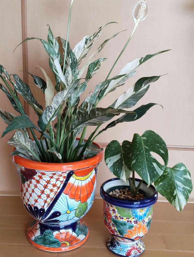 斑入りのスパティフィラムと斑入りのモンステラ お揃いの植木鉢で。スパティフィラムの花って良い香りがするのね😃