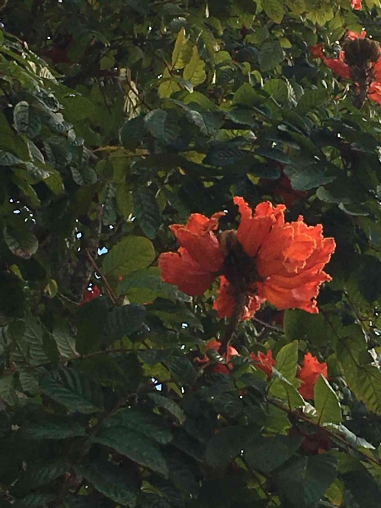 近くの小学校の前にあつたカエンボクです。この木はほぼまんかいでしたが、隣の木は、花が咲いていませんでした。なぜ?