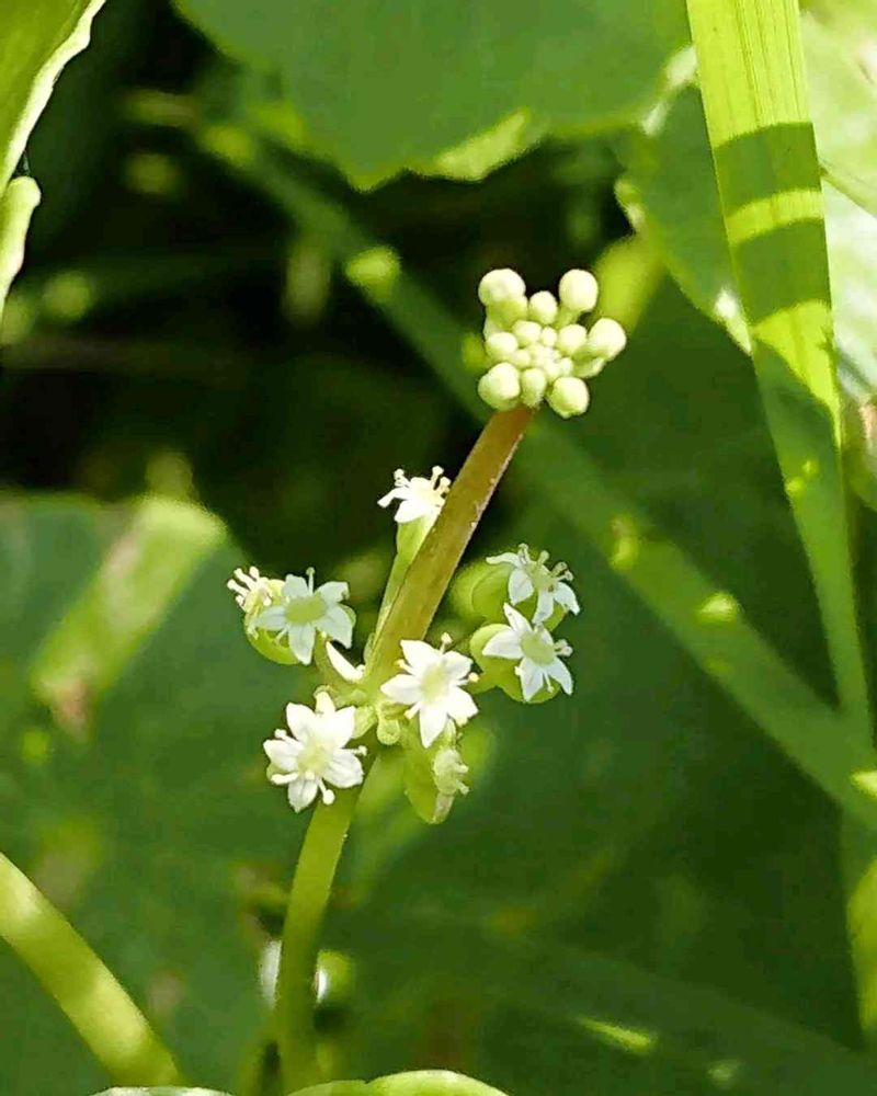 セリ科チドメグサ属の多年草。1987年に兵庫県淡路島で見出された北アメリカ南部の海岸地帯原産の帰化植物。やや湿った土地や水中に群生する。熱帯魚の水草として広く栽培されている。茎は匍匐して節から発根し、葉は匍匐茎から互生して長さ3〜20㎝の葉柄の先に直径1〜5㎝ほどの円形の葉身をつける。葉身には浅い鋸歯があり、下面に毛が散生する。葉柄は葉身の中心について楯状になる。花期は5~10月。春から初夏にかけて葉腋から葉柄と同長かやや短い花茎を出し、上部の節に小さな緑白色の5花弁を数個ずつかためてつける。果実は扁平な扁円形で長さ約2㎜。