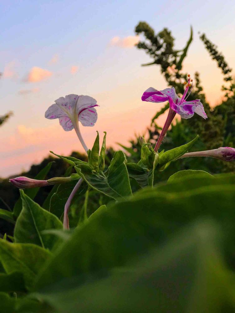 夕暮れとオシロイバナがなんとも癒されますね😊素敵な📷です💖