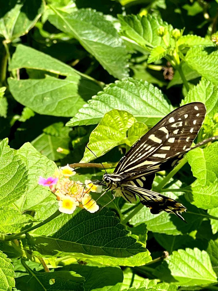 花の名前は、ランタナ。和名はシチヘンゲ(七変化)。プラス、蜜を吸っているアゲハチョウ。