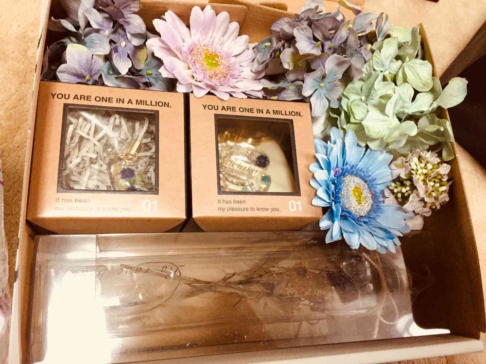 ラッピングして、梱包材にこないだ大量にストックしておいた仕事用の造花を詰めて贈ります♪