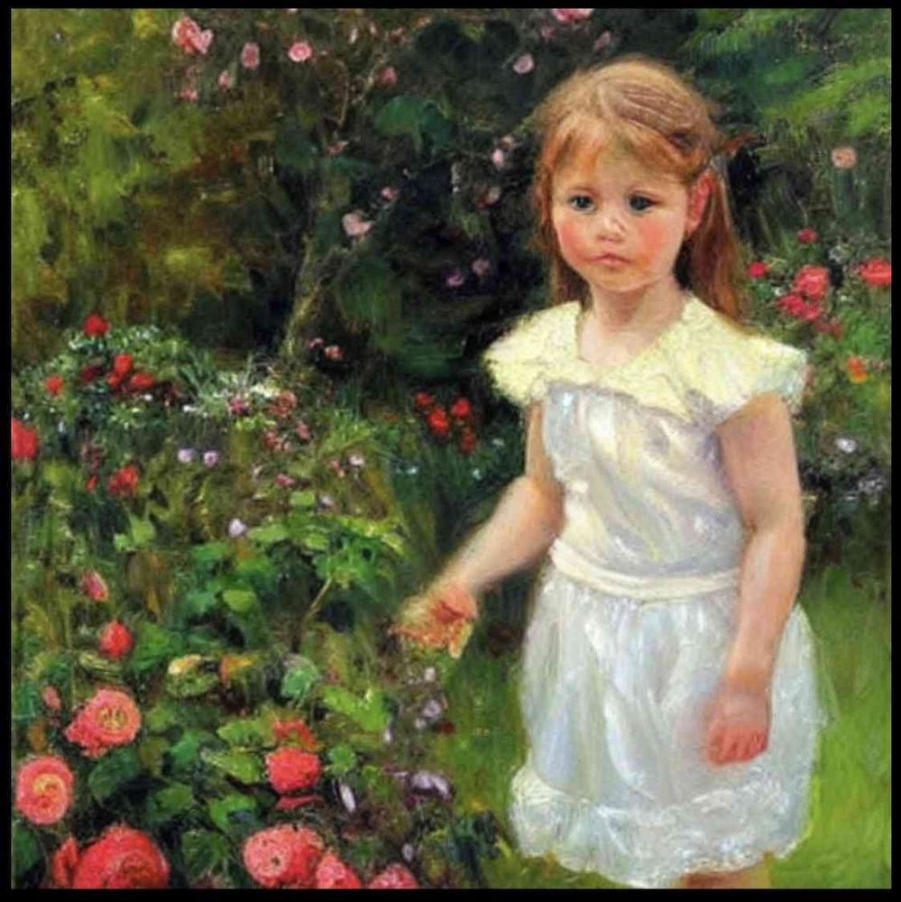 8K,高品質,写実的,油絵, Olga Wisinger-Florian, A girl in the garden,木製額付きで絵の全体を描く
