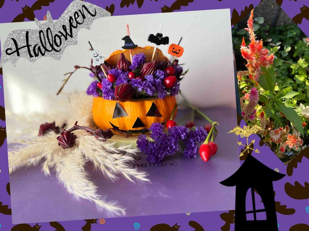 楽しい雰囲気がいっぱいの、ハロウィン🎃のフラワーアレンジメントの華やぎの世界素敵だなぁ(⌒‐⌒)🎵