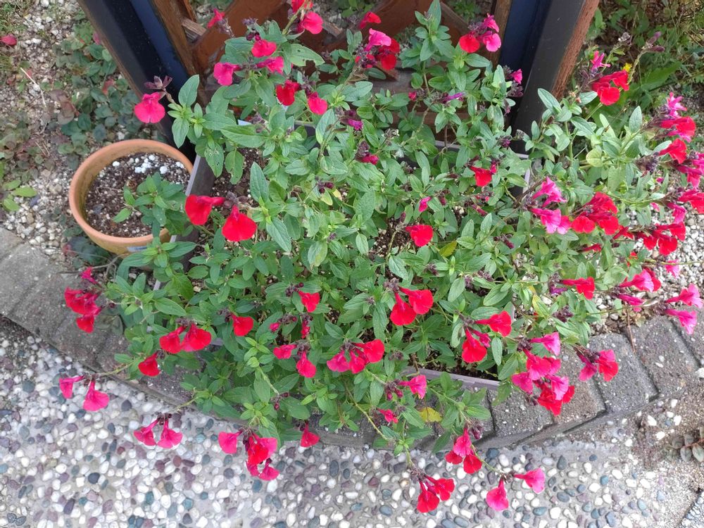 こんばんわ。玄関一番見えるとこの鉢。赤のサルビアさん良いです。