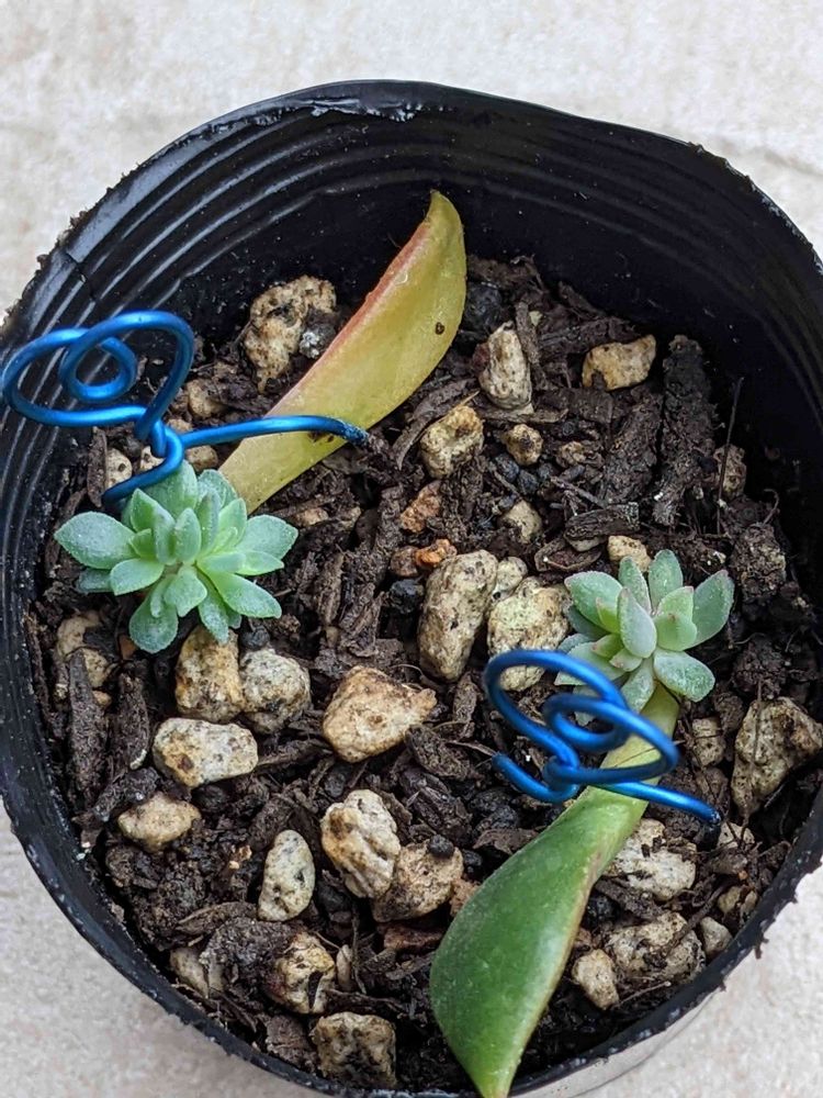 胴切りした多肉達には太いワイヤーで周りを支えてあげています。