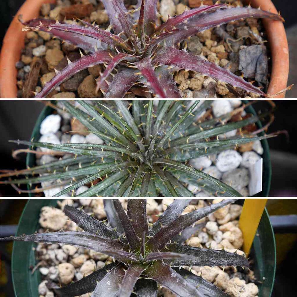 1番上が原種ダウソニー、真ん中が棘がピンクに染まるタイプ、1番下がガーネットクロウという選抜種。