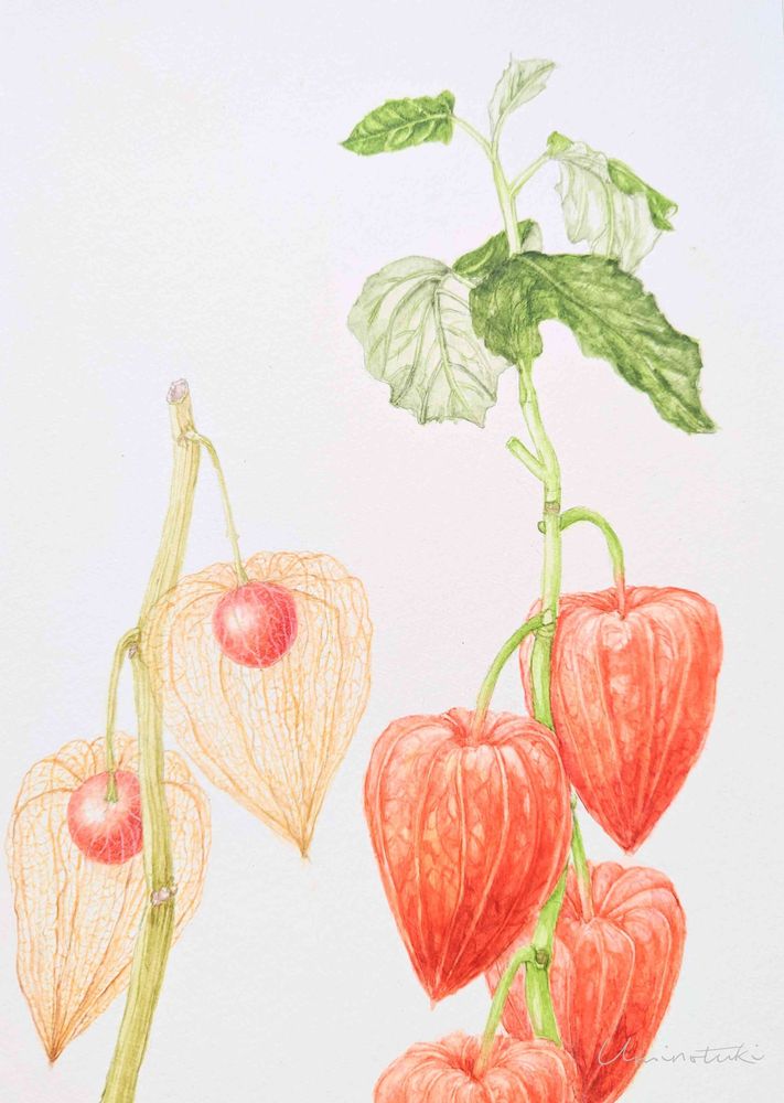 透かし鬼灯が👏👏👏👏葉脈と実がリアルに描けてて素敵~~