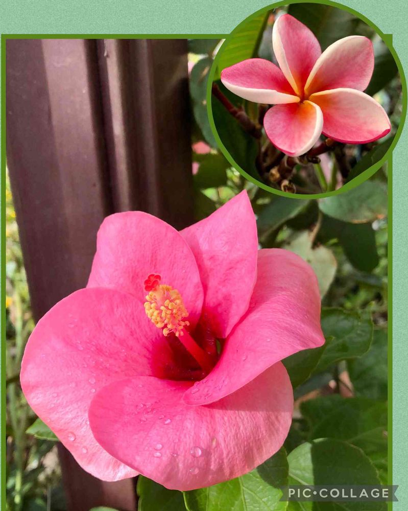 雨が降ったり止んだりの中☔️☂️咲き出した今朝のハイビスカスとプルメリア🌺🌸