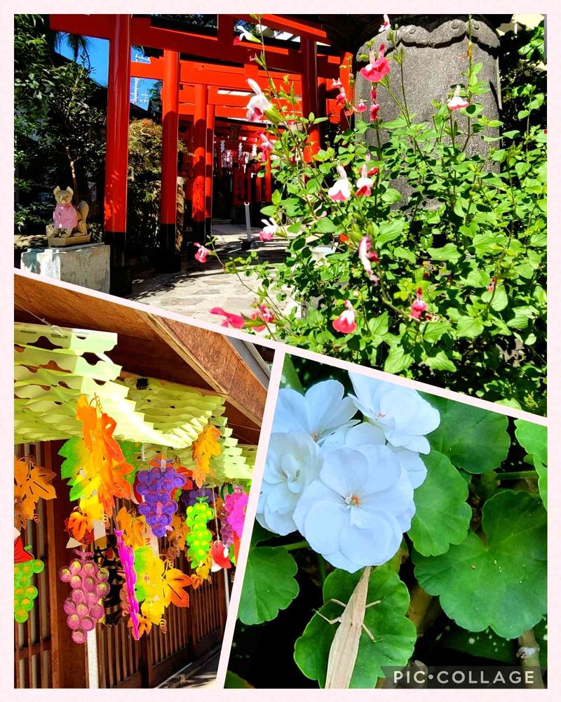 鳥居⛩️と🌼チェリーセージ🌼の赤が相俟っていい感じ😊