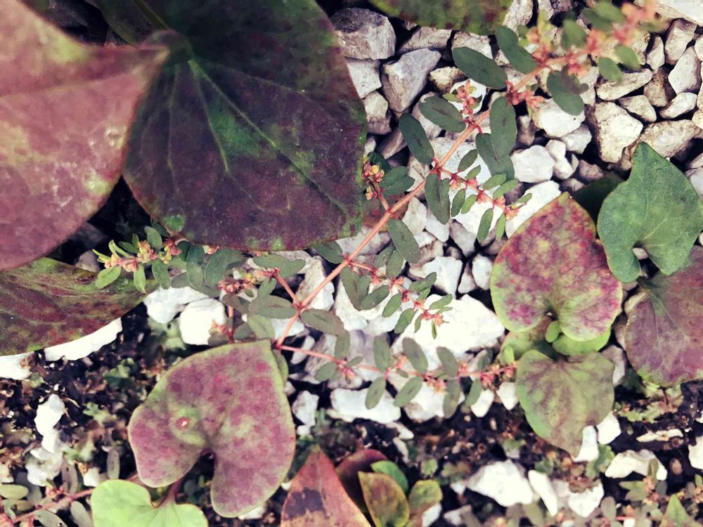 散歩の道端。ドクダミの紅葉とコニシキソウの花。