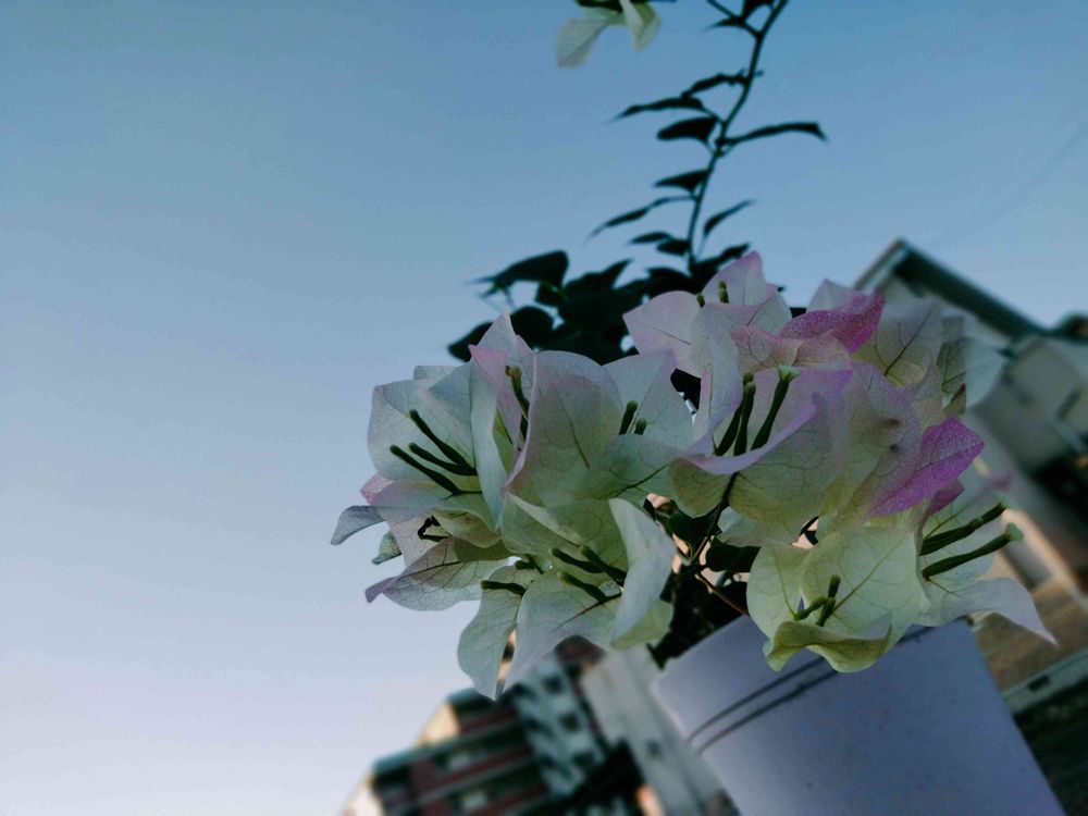 濃い色のブーゲンビリアは年に何度か見ますが、白色、白に薄ピンク色のブーゲンビリアは、咲く回数も少なく感じます。