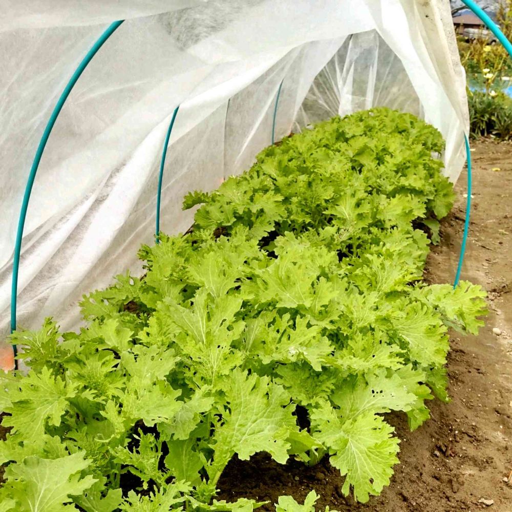 不織布のトンネルを開くと、青々と育ったわさび菜。嬉しい瞬間です💕