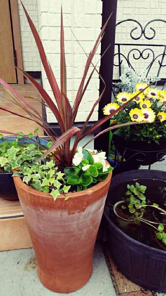 コルジリネオーストラリスのシックなコーヒー色。ずっと玄関に置きたかった寄せ植えがようやく完成しました。