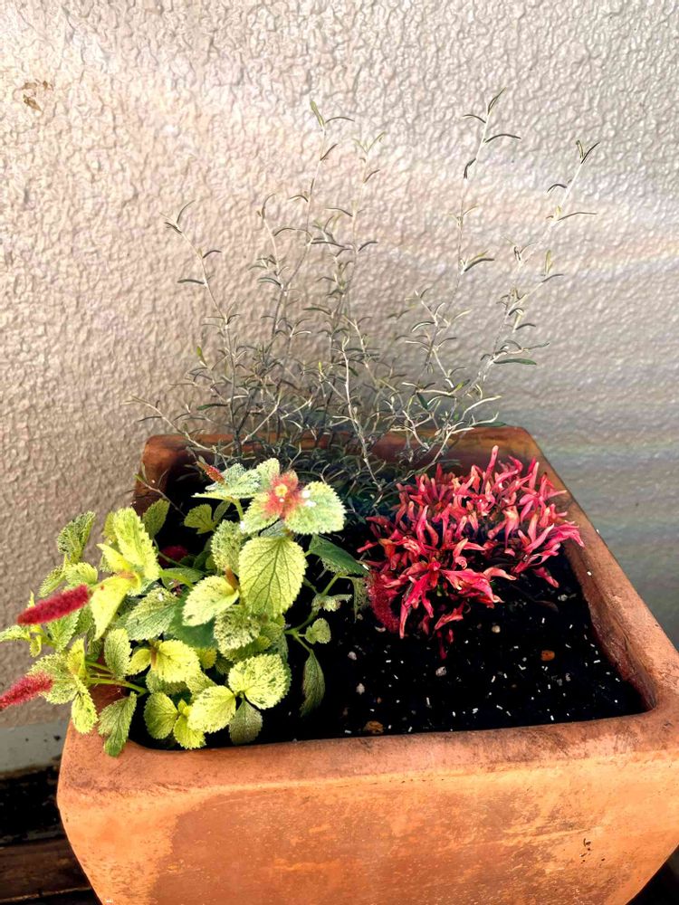 コロキアコトネアスター、アルテルナンテラフィコイデア、キャットテール。こんな寄せ植えありなのか、なしなのか。空いてるところにガーデンシクラメンでも植えたいな。それとも、植え替えの時に出てきた球根にしようかな。