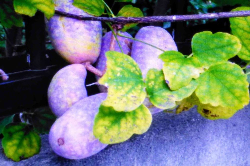 お花がなかったので、以前撮った朝の散歩道で見つけた、通り道のお宅の塀に蔦って這っていた、もう食べ頃のアケビを投稿します。