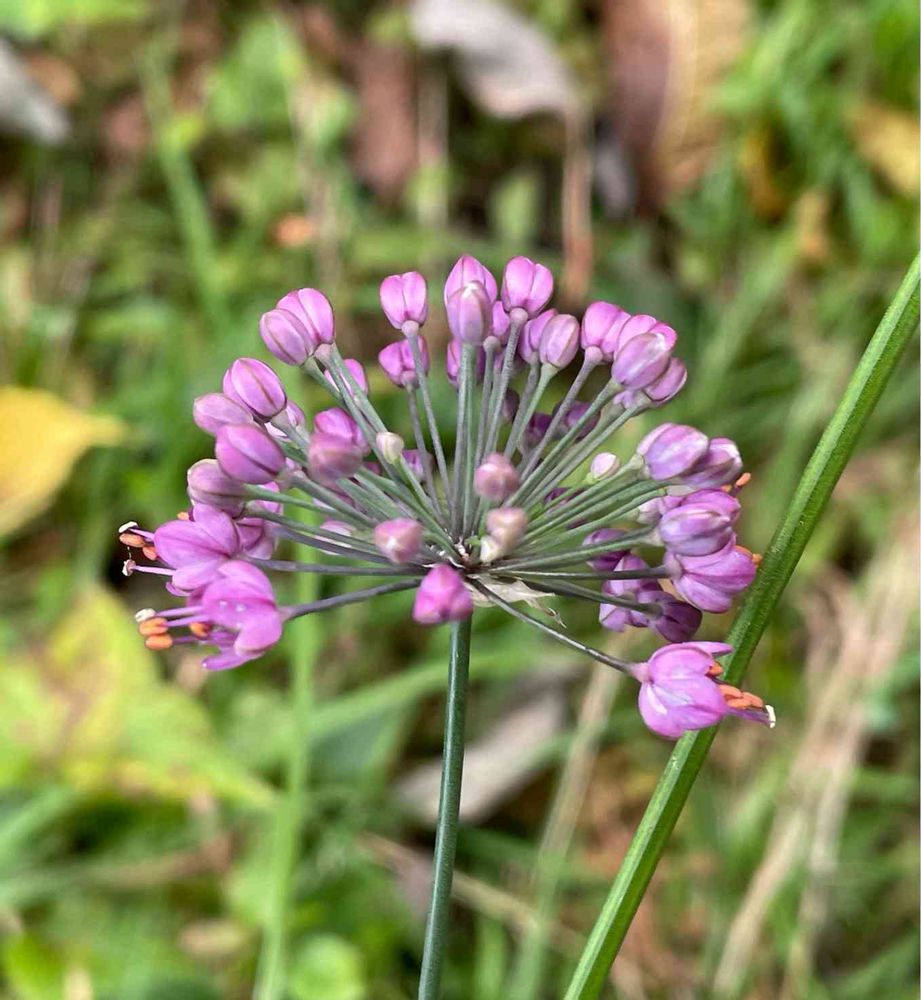 八ヶ岳南麓に秋が駆け足で降りて来た。秋の花もガクンと見かけなくなったところに、ぽつんと咲いていた紅紫色のヤマラッキョウ。愛らしい球状の散形花序に、少女漫画のような瞳になった。