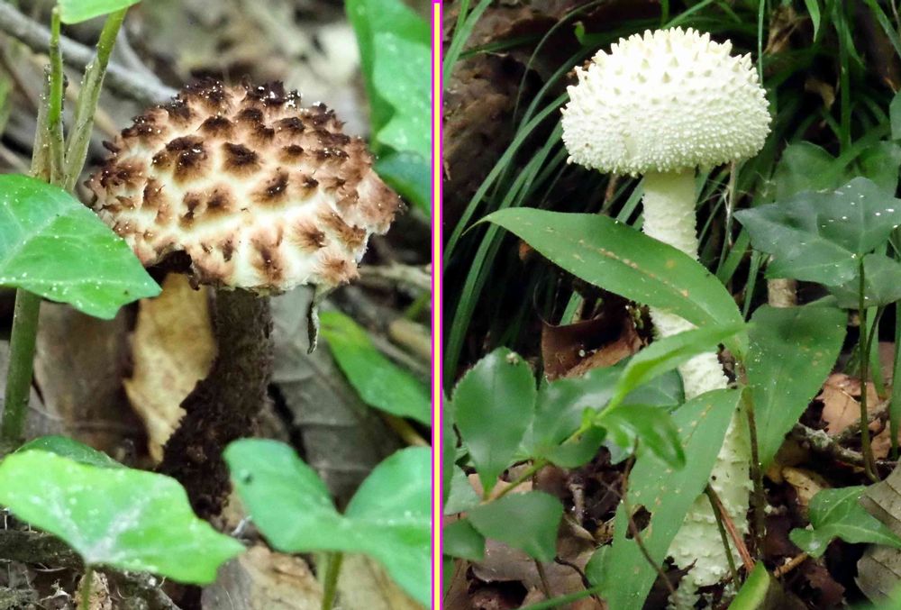 (右)シロオニタケは、全体に白いイボで覆われています。イボが尖って、おにが持つ棍棒みたい👹。