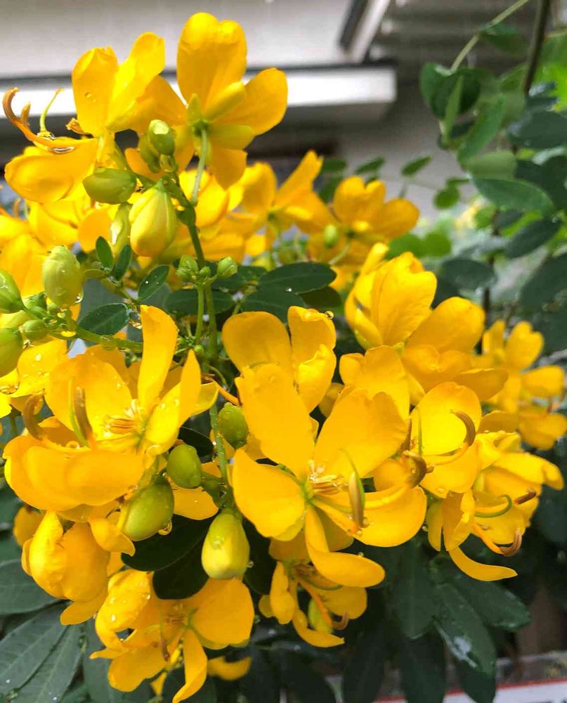 おはようございます。散歩道のお宅玄関で見かけるカッシア(アンデスの乙女)。元気モリモリ、満開になってきました。