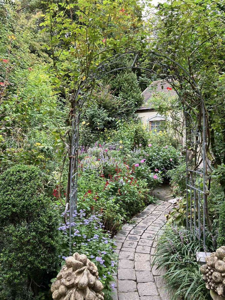アーチには蔓薔薇が咲き、花園ですね🤗