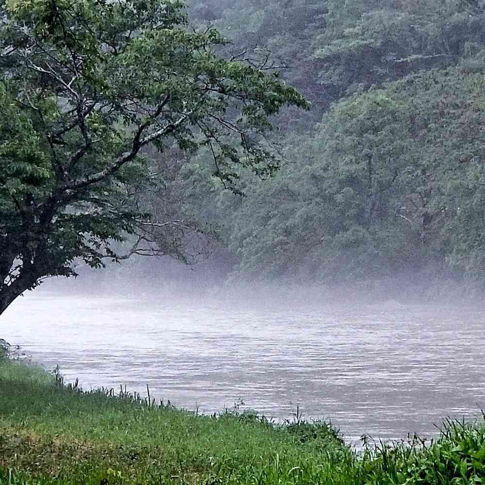 川霧ってこんな風にでるのですね。とても幻想的で心奪われます。川の流れ 立ち込める霧 霞んで見える向こう岸の木々 手前のみどり。本当に美しい!!!
