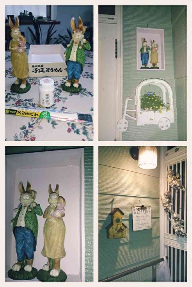 ウサギの家族オブジェを「揖保乃糸素麵」の木箱を100均の塗料スモーキーピンク色を塗って据え置きました。そして、玄関ドアの右側に飾り付けました。