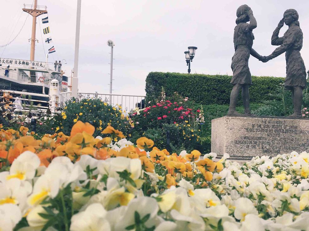 山下公園の船と銅像とお花