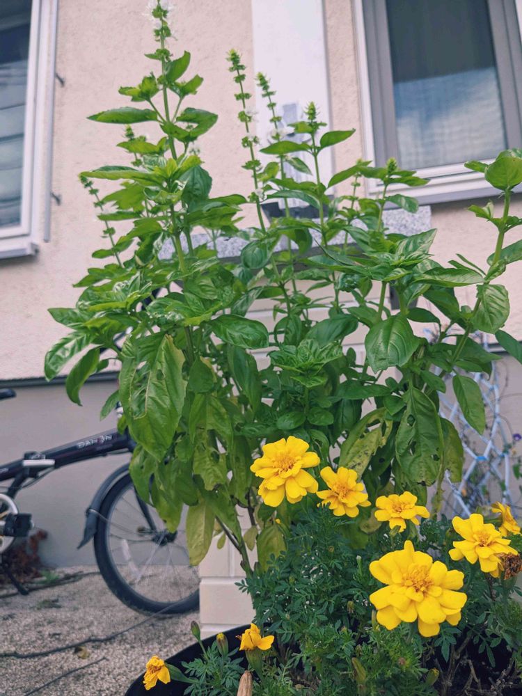 トマトを抜いたとき、あまりに元気だったから、バシルも花を咲かせて、マリーゴールドと残しました。